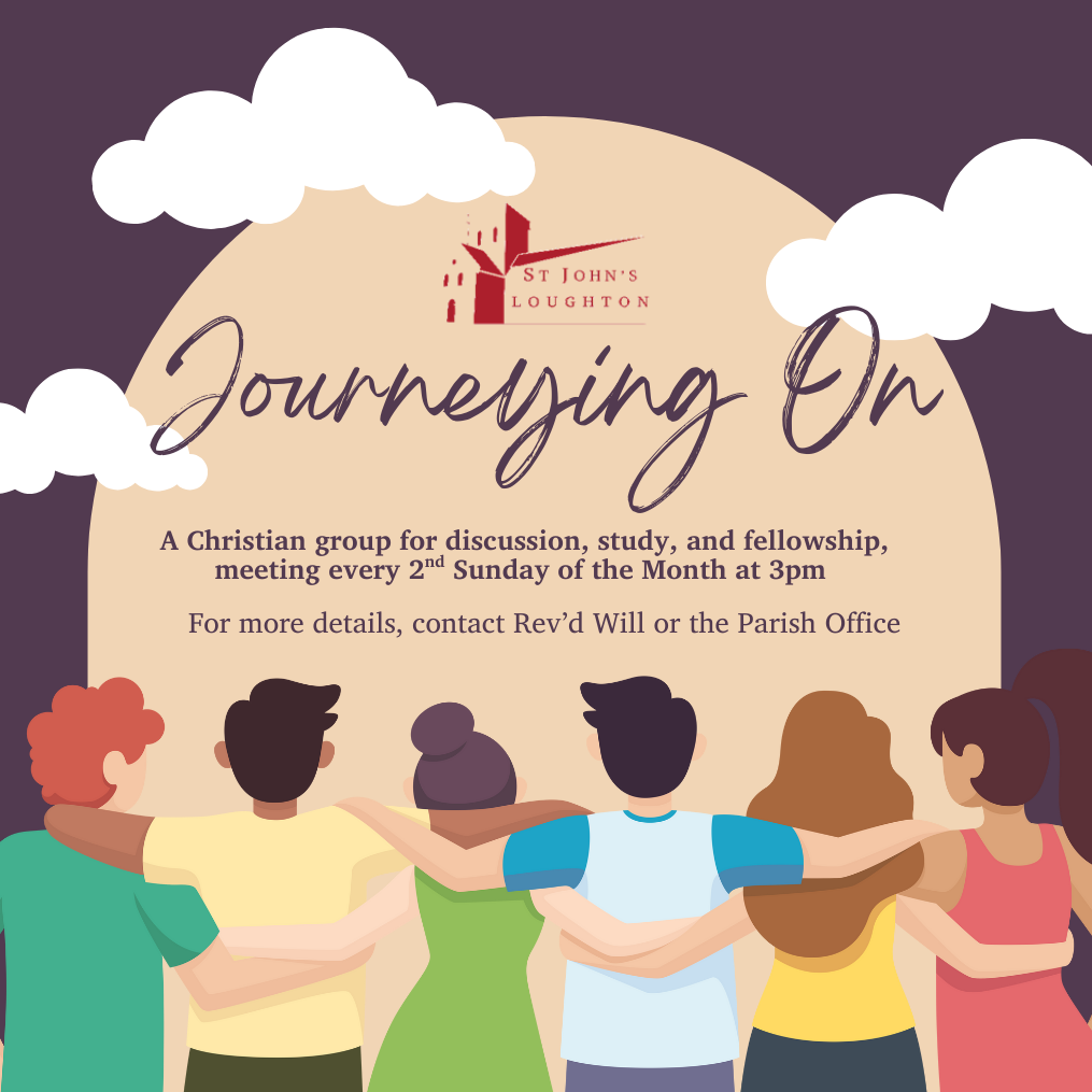 'Journeying On' is a new group for discussion, study, and fellowship. It emerged out of a successful series of Confirmation Classes and discussion groups. 'Journeying On' meets every 2nd Sunday of the Month at 3pm. Get in touch with Rev'd Will or the Parish Office for more details.